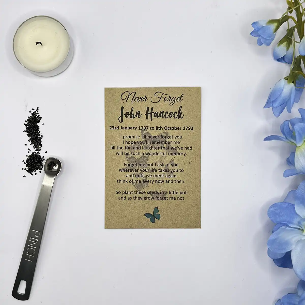 Offer a gentle, heartfelt tribute with our Forget Me Not Seed Packets, designed with a meaningful poem and delicate butterflies on the front. Ideal for funerals, memorials, or celebrations of life, these personalised seed envelopes are a thoughtful way to honour and remember someone special.