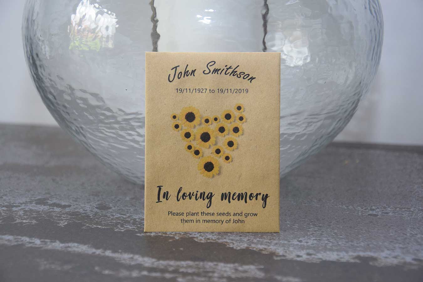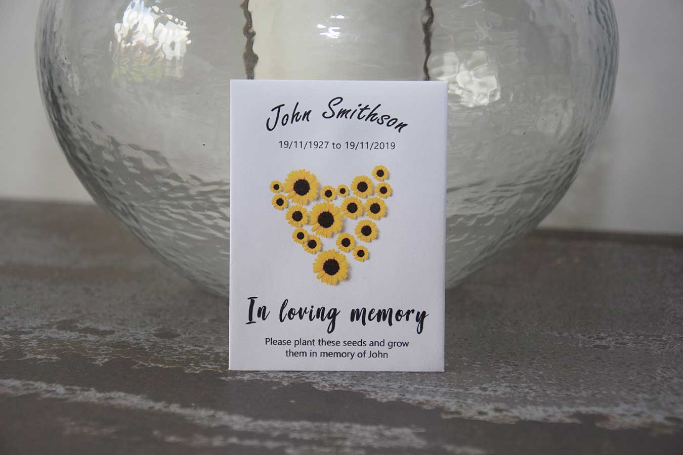Each envelope is personalised with their name and life dates, creating a memorable and meaningful keepsake for guests to take home and plant in their honour.